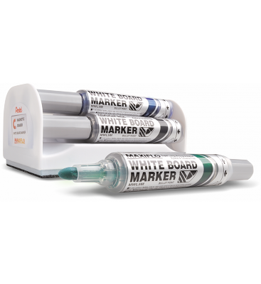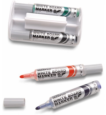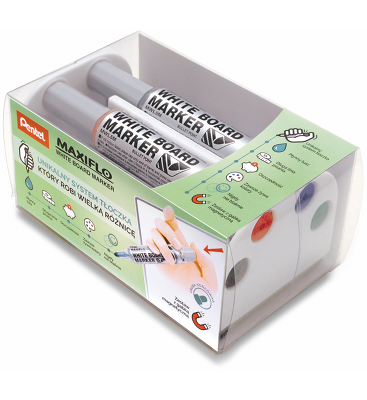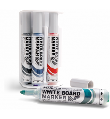 Marker MAXIFLO do białych i ceramicznych tablic. Płynny tusz dozowany w razie konieczności nawilżenia końcówki za pomocą tłoczka (zamiast tradycyjnego sączka). Marker pisze wyrazistą linią aż do ostatniej kropli tuszu. Kilkakrotnie dłuższa linii pisania niż w standardowych markerach z sączkiem - 1100 m. Nie zawiera substancji trujących ksylenu, toluenu ani polichlorku winylu. Nadaje się również na papier, plastik, karton. Wykonany w 50% z materiałów przetworzonych.
