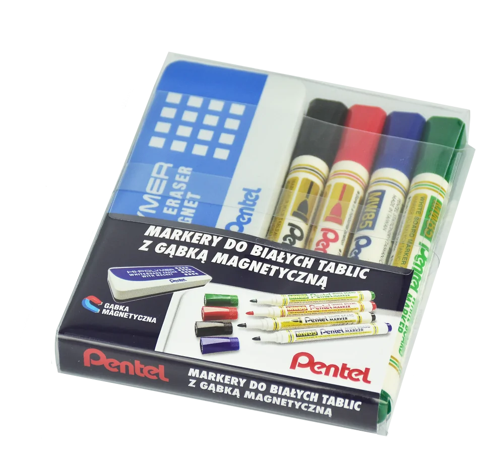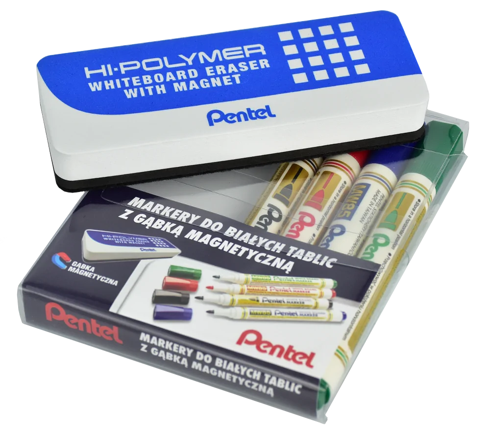 Komplet 4 ekonomicznych markerów do białych i ceramicznych tablic. Tusz jest łatwo usuwalny z powierzchni tablicy, nie pozostawia na niej trwałych śladów. Niezbędny do pracy w każdym biurze, pracowni i na uczelni. W zestawie znajduje się również gąbka magnetyczna, która z łatwością przylega do powierzchni tablicy, dzięki czemu zawsze masz ją pod ręką. Gąbka skutecznie usuwa ślady po markerach nie pozostawiając smug i zarysowań.